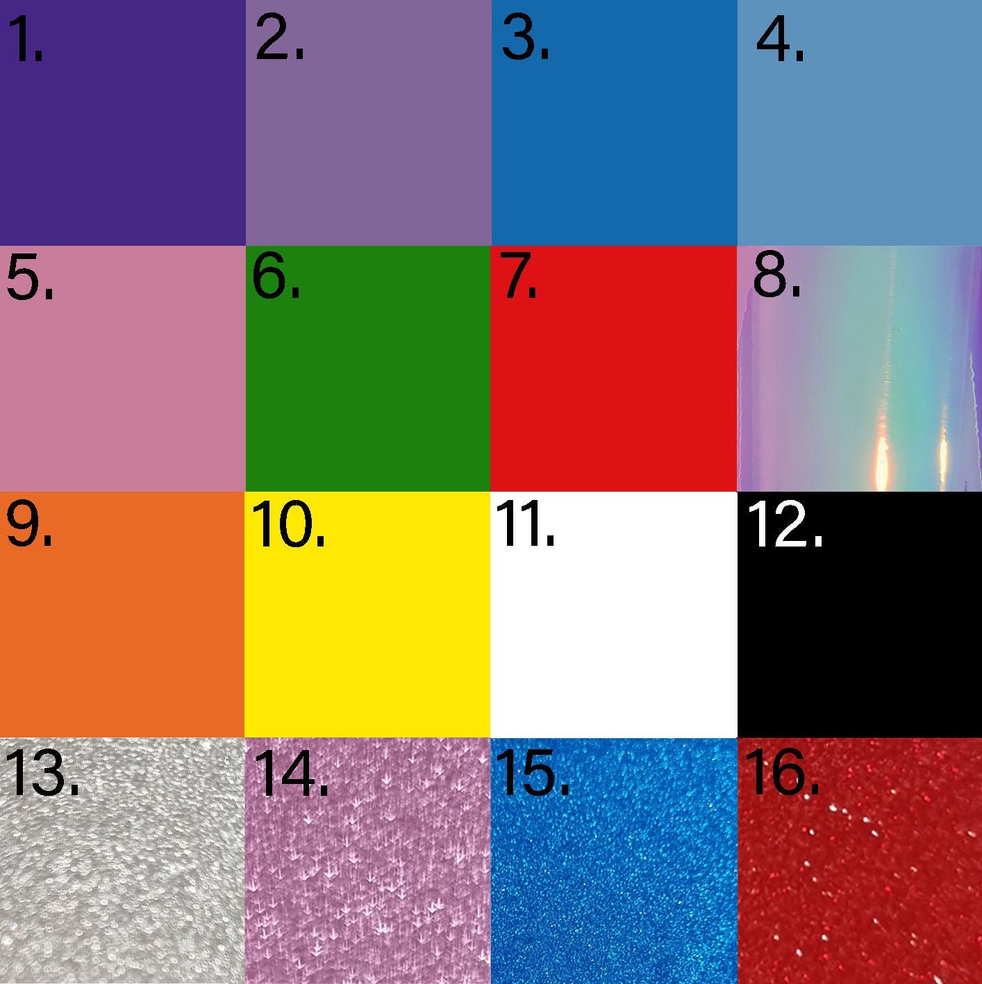 - Select your font colour ( please note colours 13-16 are only eligible for styles 1,3,5 & 6 these can only be used for the back layer ) if you have selected styles 3,5 ore 6 please select a secondary colour