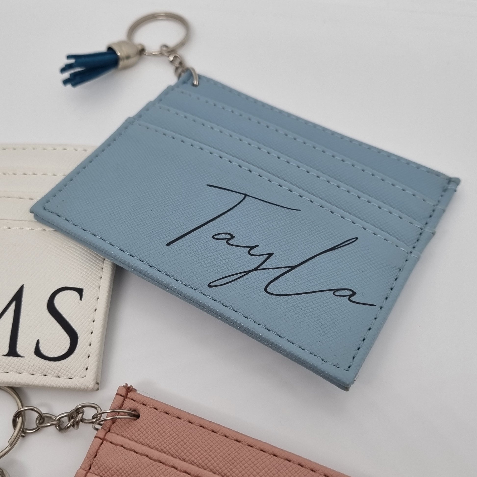 Personalised card holder keyrings with your name and choice of style/colour.